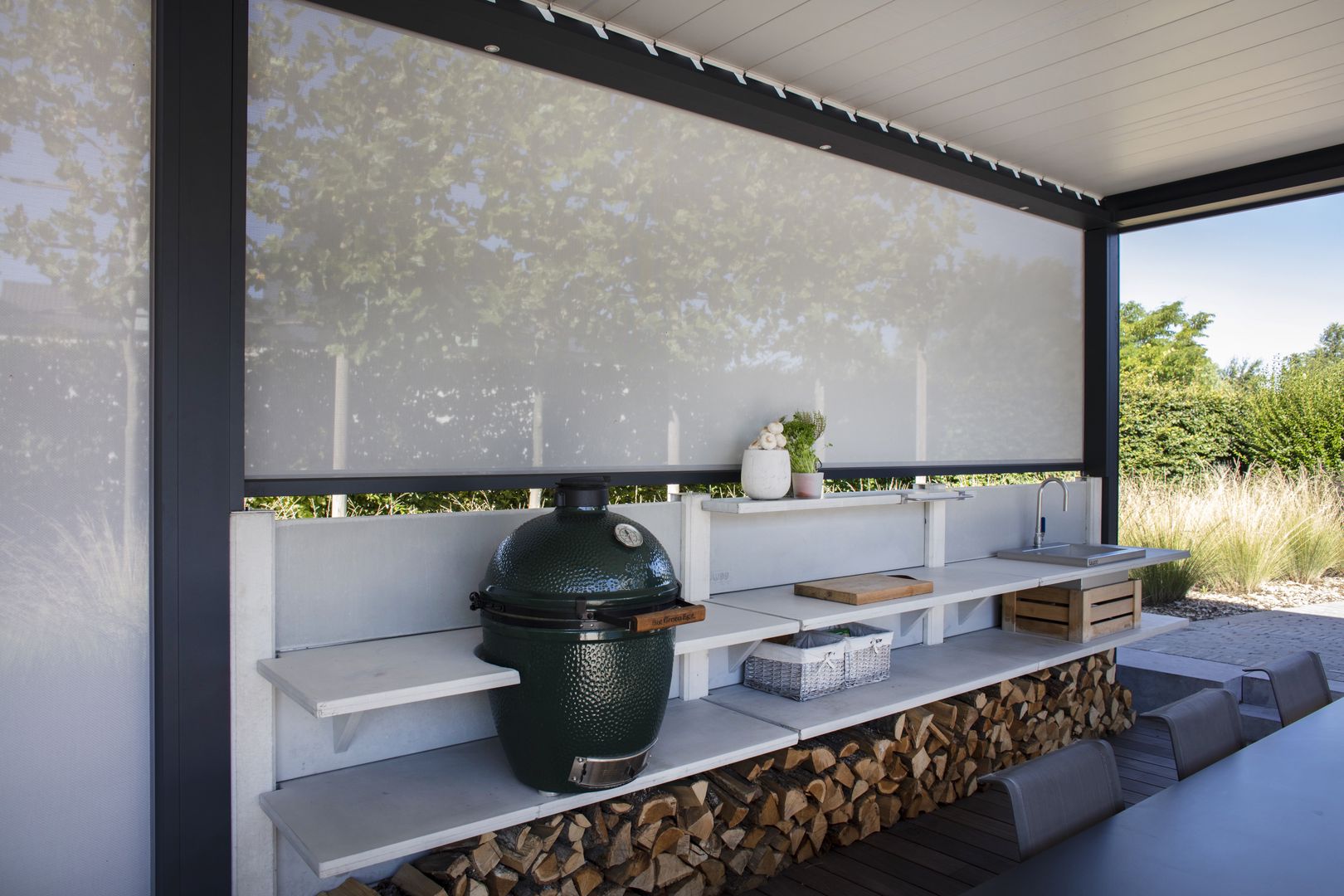 5. Zijwanden: De overkapping kan worden afgesloten met verticale screens om u te beschermen tegen wind en regen.