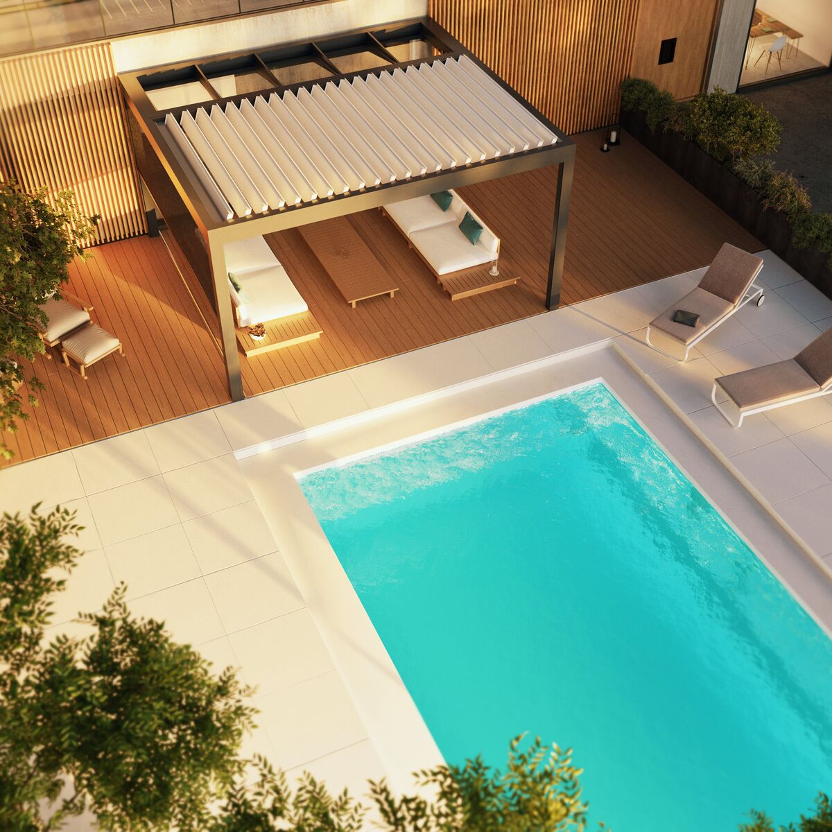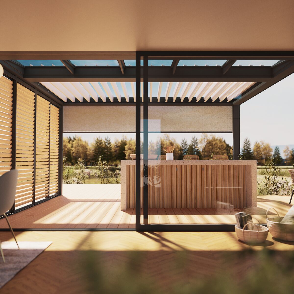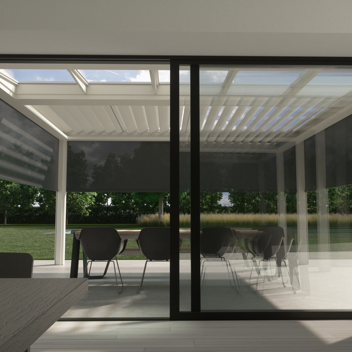 • De B720 combineert een glazen dak met kantelbare lamellen in één geïntegreerd systeem, waardoor u profiteert van zowel lichtinval als zonwering. Dit is uniek in zijn soort.