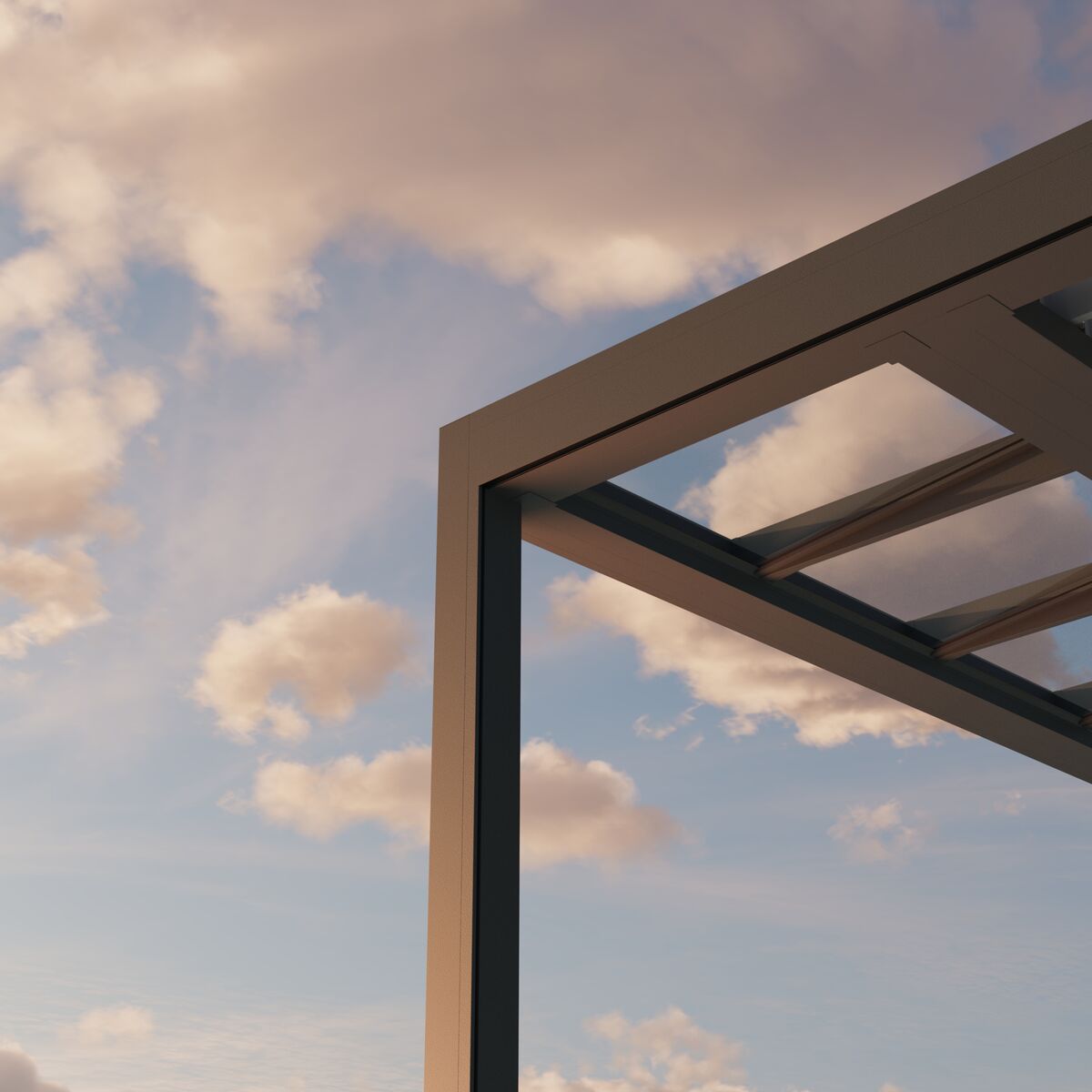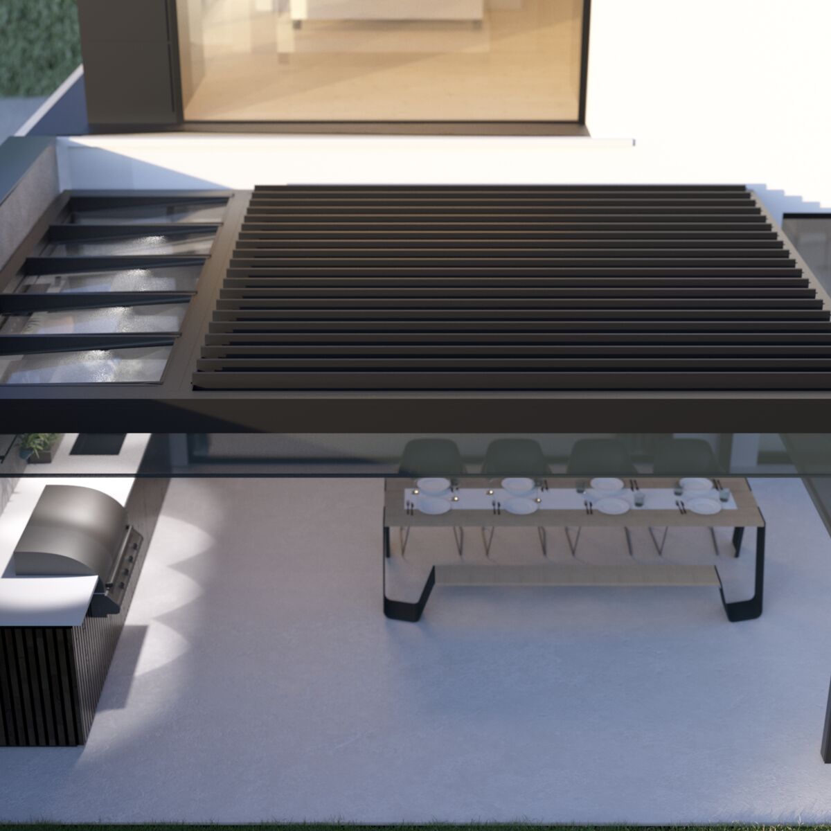De Brustor B720 is een unieke combinatie van een glazen dak en een lamellensysteem, waarbij beide elementen volledig naadloos in elkaar zijn geïntegreerd. Zo geniet je van een moderne glazen overkapping met de mogelijkheid om het licht en de zoninval volledig naar wens te regelen. De aluminium lamellen zijn kantelbaar én optioneel openschuifbaar, wat zorgt voor optimale flexibiliteit bij elk weertype.